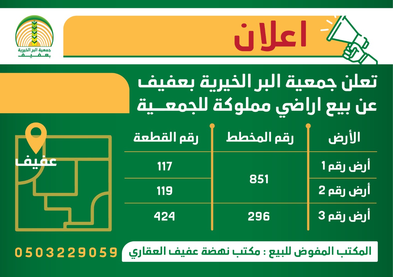 لـ Afifalbr | 17/11/2021 | الاخبار | إعلان بيع أراضي مملوكة للجمعية تعلن #جمعية_البر الخيرية بـ #عفيف عن بيع اراضي مملوكة للجمعية . زيارة مدير العلاقات العامة و برامج التطوع لسعادة رئيس بلدية محافظة عفيف توزيع فراء على العمالة طرح إستثماري تعلن جمعية البر الخيرية بمحافظة عفيف عن رغبتها في طرح إستثماري للمبنى الواقع خلف المحكمة العامة بعفيف والمبنى الواقع... طرح إستثماري اقرأ المزيد فتح باب الترشح لمن يرغب من اعضاء الجمعية العمومية يسر مجلس الادارة بجمعية البر الخيرية بمحافظة عفيف عن فتح باب الترشح لمن يرغب من أعضاء الجمعية العموميه ممن تنطبق عليه... فتح باب الترشح لمن يرغب من اعضاء الجمعية العمومية اقرأ المزيد رئيس وأعضاء مجلس إدارة جمعية البر الخيرية بعفيف يهنئون القيادة الرشيدة بحلول شهر رمضان المبارك ... رئيس وأعضاء مجلس إدارة جمعية البر الخيرية بعفيف يهنئون القيادة الرشيدة بحلول شهر رمضان المبارك اقرأ المزيد