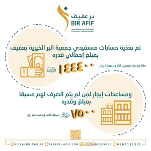 تم بفضل الله تغذية حسابات مستفيدي #جمعية_البر_الخيرية_بعفيف بمبلغ إجمالي قدره مائة وأربعة وأربعون ألفاً وأربعمائة ريال ( ١٤٤٤٠٠) ريال بالإضافة إلى مساعدات إيجار لمن لم يتم الصرف لهم مسبقا بمبلغ وقدره سبعة الاف وخمسمائة ريال (٧٥٠٠) ريال