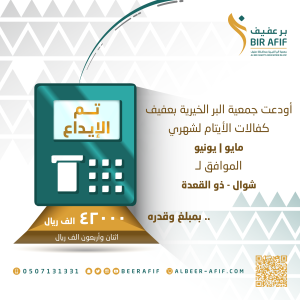 بفضل من الله أودعت #جمعية_البر_الخيرية_بعفيف كفالات ايتامها لشهري مايو ويونيو من عام 2023م في حسابات المستفيدين من الأيتام بقيمة 42000 ريال.