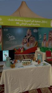 تقرير مشاركة جمعية البر الخيرية بمحافظة عفيف بمناسبة اليوم الوطني (٩٣) و المقام بالمهرجان المعد من قبل بلدية محافظة عفيف بهذه المناسبة ، حيث قدم في ركن الجمعية توزيع الهدايا على الحضور و كذلك تم عرض بعض التقارير و المنشورات، وتم زيارة القسم من قبل مشرف وزارة التنمية وبعض الإعلاميين
