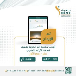 تم وبفضل الله ايداع كفالات #أيتام #جمعية_البر_الخيرية_بعفيف لشهري سبتمبر واكتوبر 2023م الموافق لشهري صفر-ربيع اول 1445هـ وذلك بمبلغ وقدره 52000 “اثنان وخمسون ألف ريال”.