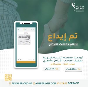 تم وبفضل الله إيداع كفالات أيتام جمعية البر الخيرية بعفيف لشهري نوفمبر وديسمبر 2023م الموافق لشهري جمادي الأولى -جمادي الاخر 1445هـ وذلك بمبلغ وقدره 54400ريال .