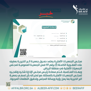 مجلس الجمعيات الأهلية يعتمد حصول #جمعية_البر_الخيرية_بعفيف على العضوية الكاملة (أ) برقم 97 ضمن الجمعية العمومية لمجلس الجمعيات الأهلية في منطقة الرياض. وبهذه المناسبة، قدّم سعادة رئيس مجلس الإدارة شكره وتقديره لمجلس الجمعيات الأهلية بالمملكة، مع تمنياته بأن تسهم جمعية البر الخيرية بما يعزز رؤية ورسالة المجلس وتحقيق التطلعات المرجوة.