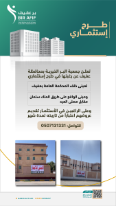 تعلن جمعية البر الخيرية بمحافظة عفيف عن رغبتها في طرح إستثماري للمبنى الواقع خلف المحكمة العامة بعفيف والمبنى الواقع على طريق الملك سلمان مقابل مصلى العيد وعلى الراغبين في الاستثمار تقديم عروضهم اعتباراً من تاريخ ١٢ / ٣ / ١٤٤٧هـ ولمدة شهر.